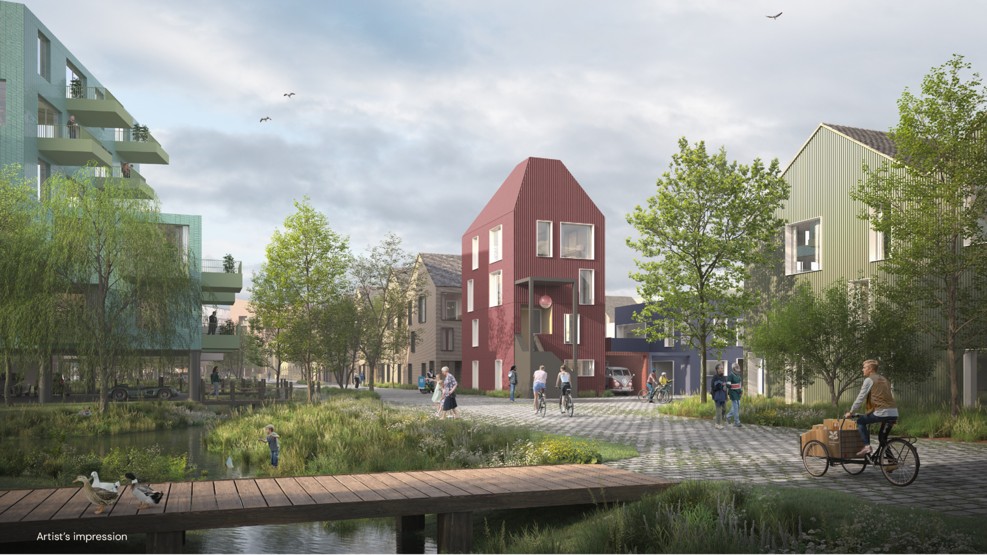 The wider neighbourhood will be well connected and welcoming, with shared community spaces, green routes, landscaped areas and riverside amenities for the community.